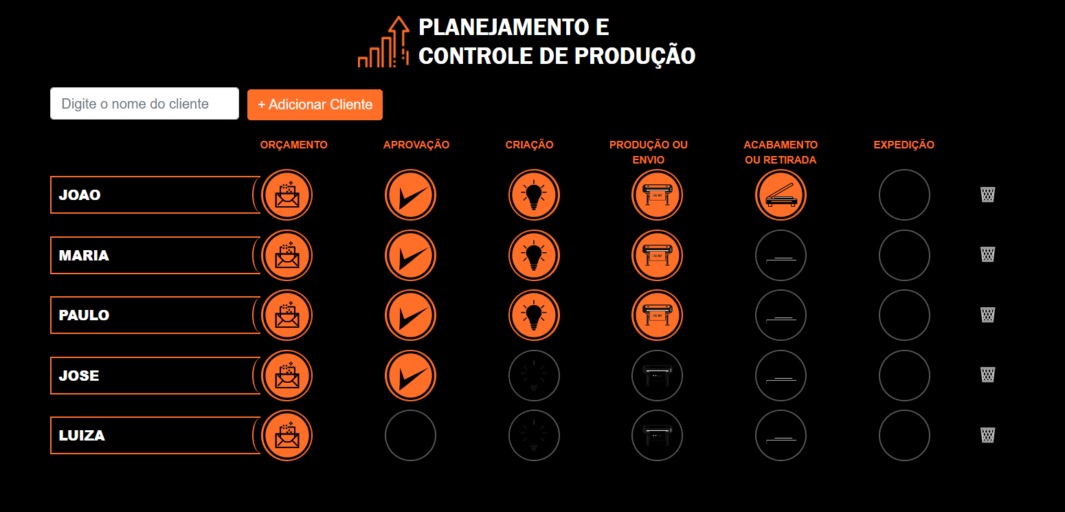 🔹 Etapas personalizadas: Orçamento, Aprovação, Criação, Produção, Acabamento e Expedição!